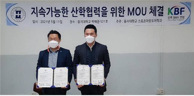 을지대학교 스포츠아웃도어학과(학과장 문황운)와 (사)한국BMX연맹(회장 김준희)이 지난 11일 을지대학교 스포츠아웃도어학과에서 교육사업 확대 및 상호 발전을 위한 업무 협약(MOU)을 맺었다.