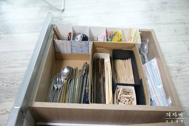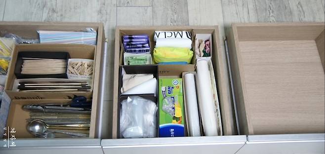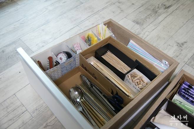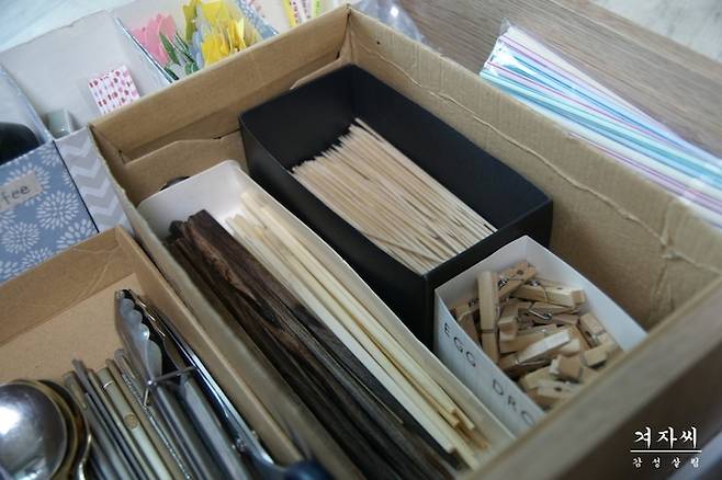 신발박스를 넣어 크게 공간을 나누고 작은 박스 등으로 용도별 크기별로 수납하기! 나뭇젓가락 종류와 과일꼬치 등은 집에 있나없나 한번 씩 헷갈려서 또 사기도 하는데...이렇게 해두면 다음 번에 안사는 걸로^^