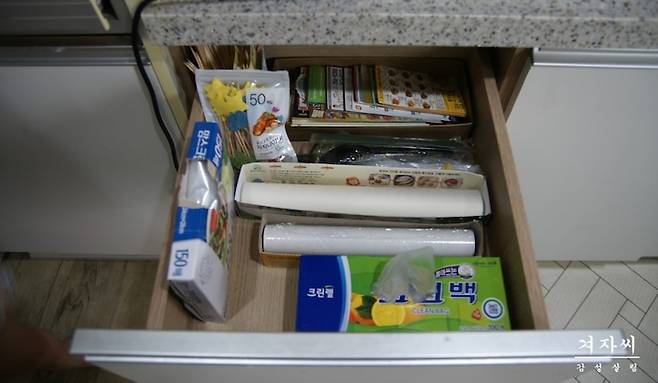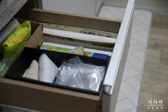 씽크대 서랍에도 충분히 보관할 수 있지만, 자주 쓰는 용품들은 이렇게 꺼내놓고 정리해야 살림하기 편하다는 거~!