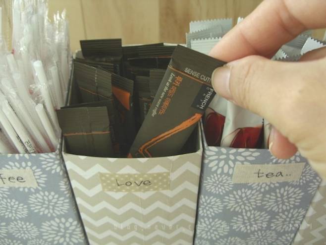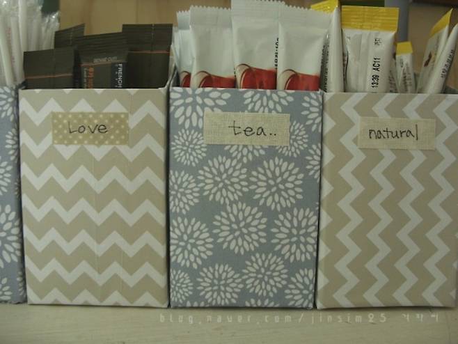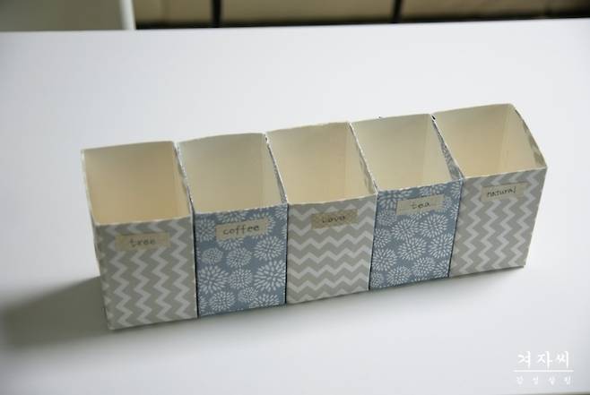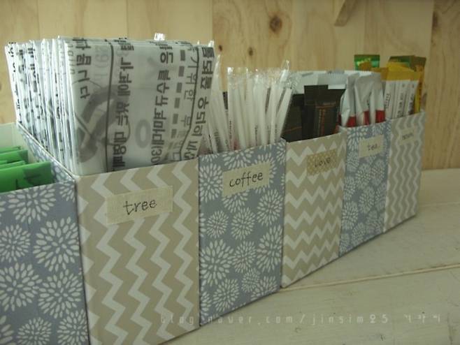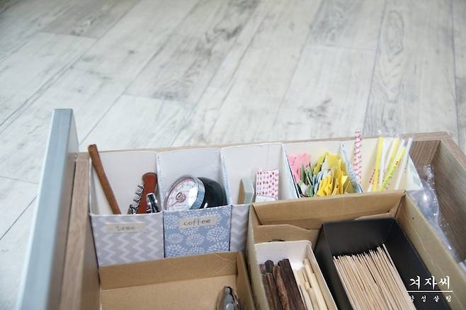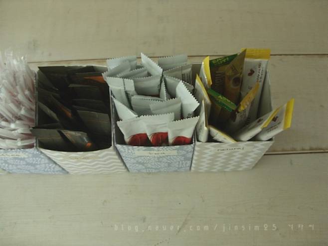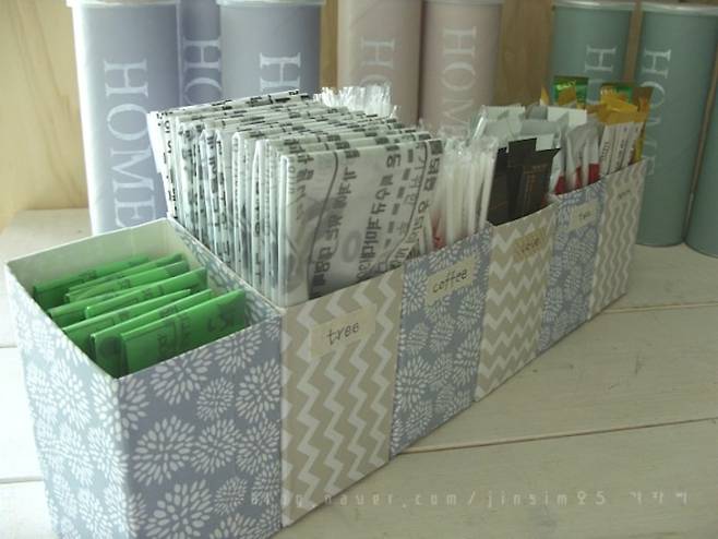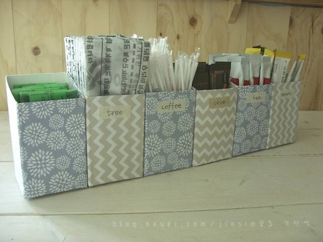 위에서 소개했던 우유갑을 활용한 샤방한 주방 수납 소품은 칸칸이 정리하기에 딱이에요.