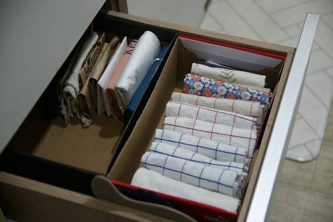 선반에 올려둔 키친크로스와 작은 종이봉투 등이 있어서 수납했습니다.
