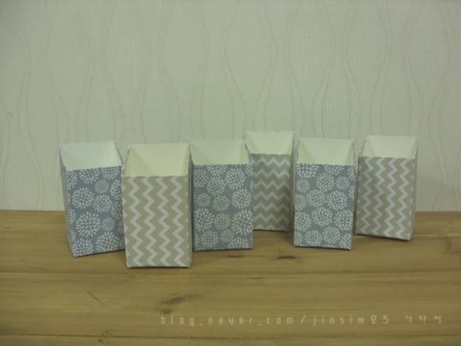 캬~~ 너무 이쁩니당^^ 나름 은은한 느낌으로 맞춰보았어요^^ 리폼한 우유갑의 옆 면끼리 글루건으로 고정.