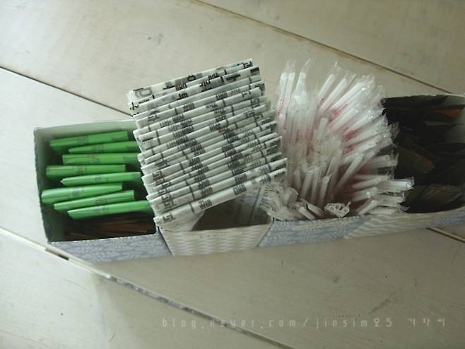 저희 동네에 새로 생긴 토스트 가게의 포장종이 입니다~ 요거 다들 아시죠?^^네모 반듯하고 예뻐서 이것 또한 모았...! (이러니 서랍이나 선반이 가득이네요^^) 서랍 틈새에 수납용기로 쓰기 좋아요~