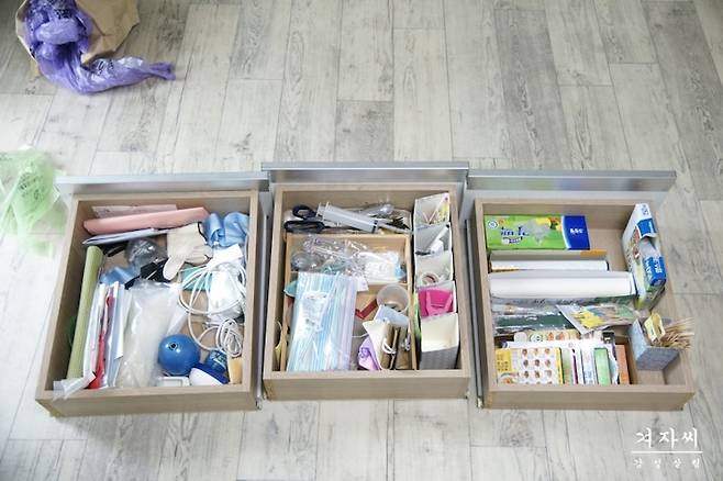 서랍 1층은 요리할 때 필요한 호일, 랩, 비닐팩, 1회용 장갑 등등으로 2, 3층은 자주 사용하지 않는 용품 위주로 정리해놓고, 살면서 또 정리해야죠~^^