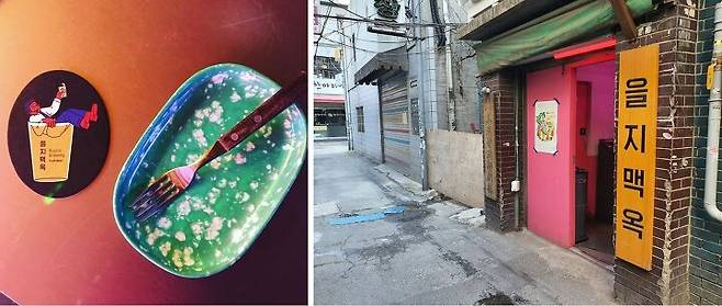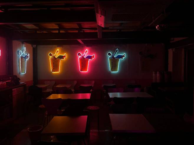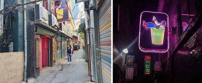 낮에는 평범한 골목길이었다가 밤만 되면 네온사인 불빛으로 완전 새로운 공간이 되는 곳이 있어요. 인쇄소가 모여있는 회색빛 골목을 이리저리 걷다 보면 저 멀리 핑크빛 조명이 퍼져 나오는데요. 와이셔츠에 넥타이를 맨 남자가 시뻘건 얼굴을 하고 맥주잔에 빠져 있는 간판을 찾아보세요. 이 간판이 <을지맥옥>의 상징이랍니다.