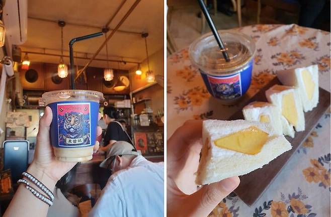 호랑이에 오면 꼭 먹어봐야 하는 게 두 가지 있어요. 바로 시그니처인 호랑이 라테와 후르츠 산도에요. 인생 라테라고도 불리는 호랑이 라테는 고소하면서도 은은한 단맛이 매력적인데요. 우유에 어떤 마법이 숨어있나 할 정도로 계속 생각나는 단맛이랍니다. (피곤이 사르르)