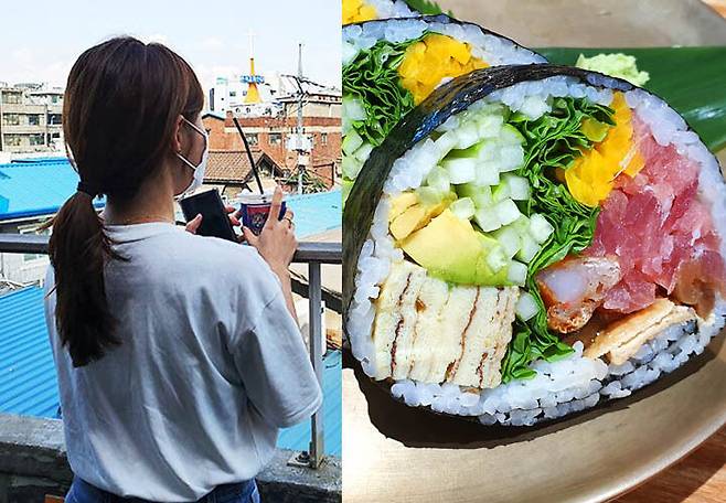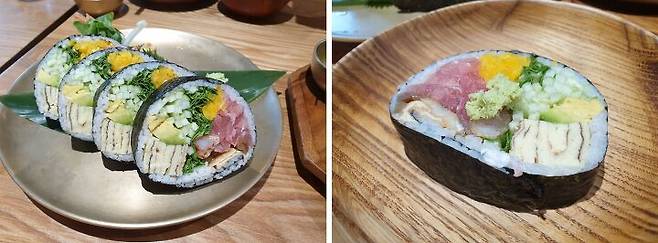 <진작>을 알게 된 건 후토마키라는 일본식 김밥 때문이었어요. 한입에 들어가기도 어려울 정도로 큰 크기에 크게 놀라는 것도 잠시. 참치, 장어, 새우튀김, 계란말이와 야채들이 어우러진 풍성함에 두 번 놀란답니다. 고소하고 상큼한 맛의 조화가 일품이라는 사실. (고추냉이를 올려 먹으면 더 맛있어요!) 인증샷을 안 찍을 수가 없겠죠?