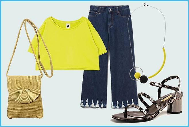 금발에 어울리는 상큼한 옐로우 크롭티 코디