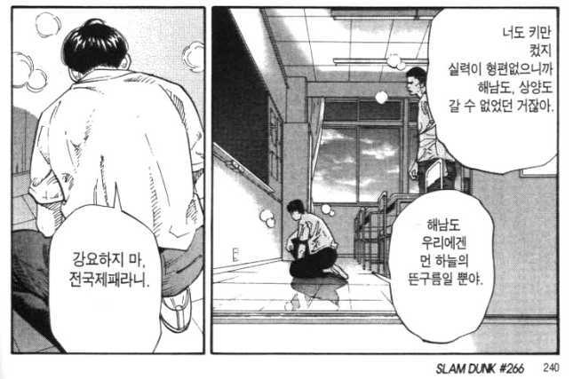 슬램덩크의 명대사를 뽑으라고 한다면 개인적으로 3위 안에 넣을 대사다. 채치수가 슬램덩크가 시작하는 무렵인 3학년 때 이미 도내에서 센터 자리에선 짱을 먹고 있을 때, 아니 그전 2학년 때 도내 전문가들로부터 변덕규보다 우위라는 평가를 받았을 때일지도 모르겠지만 변덕규는 항상 채치수라는 그늘에 가려진다. 그것도 무려 키는 자기가 더 큰데 채치수에게 발리니까 스트레스가 엄청날 것이다.