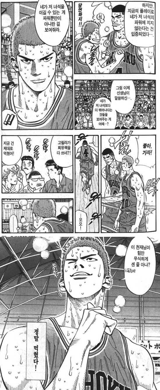 중요한 건 호열의 대사 “고릴라가 회유책을 다쓰네…”인데 그만큼 채치수가 이런 일을 한 적이 없다는 것이고, 그런 이미지라는 것이다. 이 장면 외에도 서태웅, 강백호, 송태섭, 정대만 등 강력한 팀 동료를 얻은 순간부터 채치수는 조금씩 달라지는 모습을 보여준다. 특히 마지막에 신현철이라는 벽을 만났을 때 ‘가자미’로의 변화는 아주 크다.