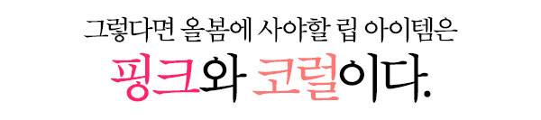이번 시즌은 '봄'하면 떠오르는 생동감, 화사함을 어느 때보다 자연스럽게 표현하는 것이 중요하다. 옷차림이 가벼워지고 컬러도 화사해지는 만큼 입술에 가벼운 포인트를 더하기만 해도 많은 변화를 줄 수 있을 것이다. 하지만 선명한 핑크와 코럴이 자신의 입술에 어울리지 않는다면 화이트, 블랙이 가미된 채도 낮은 컬러를 선택해도 좋다. 나에게 맞는 톤의 핑크와 코럴을 선택한다면 '봄'다운, '봄'스러운 메이크업을 그 누구보다 쉽게 즐길 수 있을 테다.