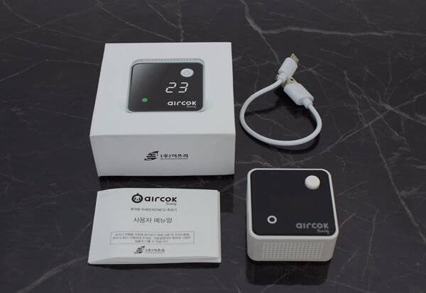 에어콕 패밀리 패키지 박스를 열어보니 휴대용 미세먼지 측정기와 USB 케이블, 매뉴얼이 들어있었다. 한 가지 아쉬운 점이 있다면 USB 케이블이 너무 짧다는 것이다. 아무래도 작은 패키지 박스에 USB 케이블을 포함시키려고 하다 보니 짧게 만든 게 아닐까 생각했다.