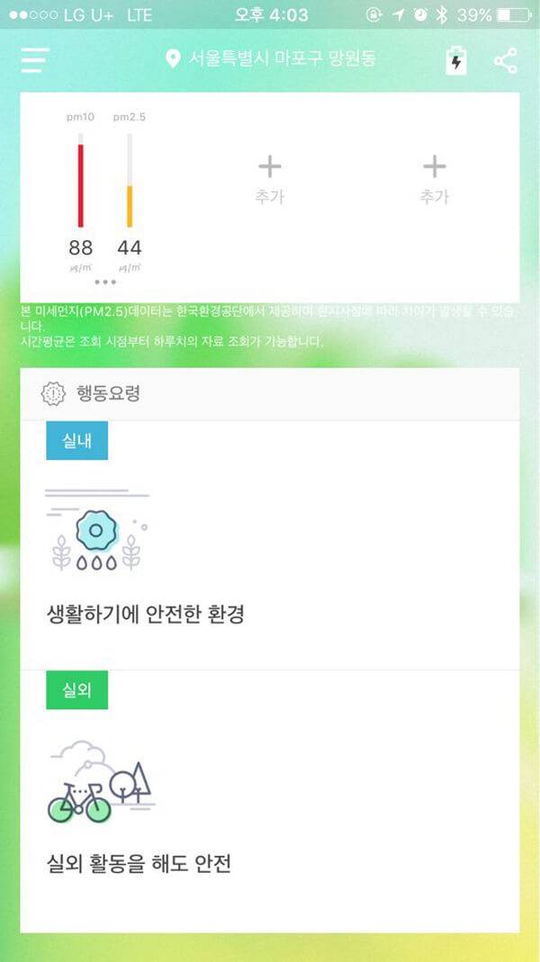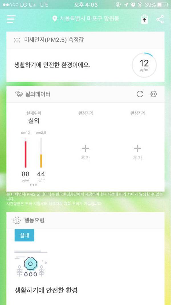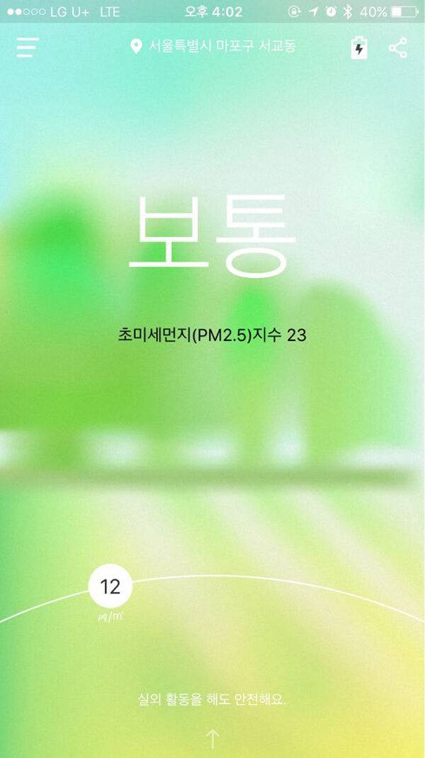 미세먼지 측정기를 이용해 현재 위치(서울시 마포구 서교동) 미세먼지를 측정해보았다. 미세먼지(PM 10) 지수는 12㎍/㎡, 초미세먼지(PM 2.5) 지수는 23㎍/㎡으로 확인됐다. LED 지시등의 초록색 불빛과 함께 스마트폰 화면에도 초록색 배경에 '보통'이라는 글씨가 나타났다. 화면을 아래로 내려보니 '보통' 상태에 맞는 실내 및 실외 행동요령을 알려주었다. 현재 상태는 실내에서 생활하기에 안전한 환경이고, 실외 활동을 해도 안전한 상태라는 것을 확인할 수 있었다.