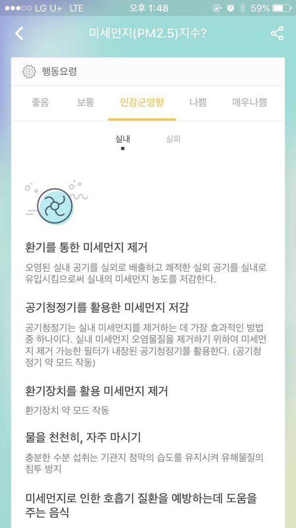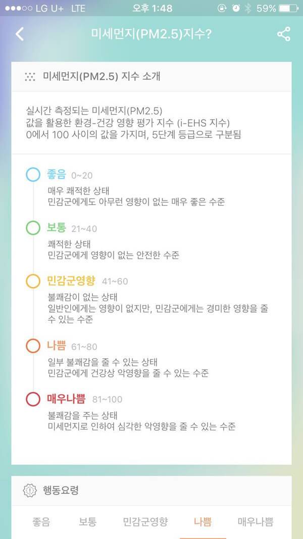 미세먼지(PM 2.5) 지수 메뉴를 선택하면, 미세먼지 지수에 대한 여러 가지 정보를 수집할 수 있다. 화면 상단에서는 미세먼지 지수를 5단계 등급으로 구분해 각 등급에 대해 소개하고, 하단에서는 각 등급에 알맞은 실내 및 실외 행동요령을 제시한다. 이에 미세먼지 지수에 따라 적절한 행동을 취해 미세먼지로 인한 고통을 최소화할 수 있다. 특히 민감군에 속하는 사용자라면 더욱더 유용할 것이다.