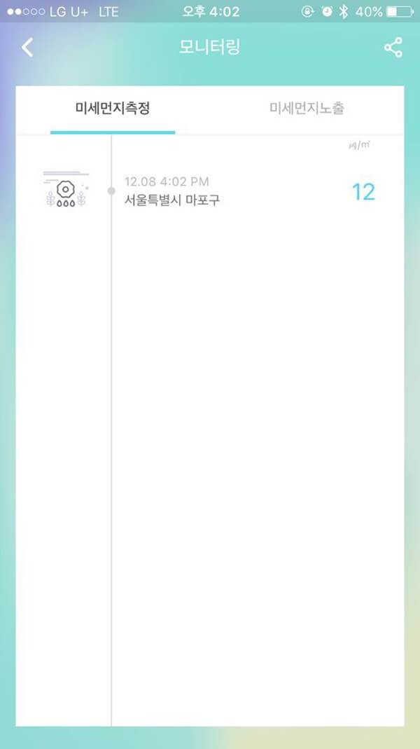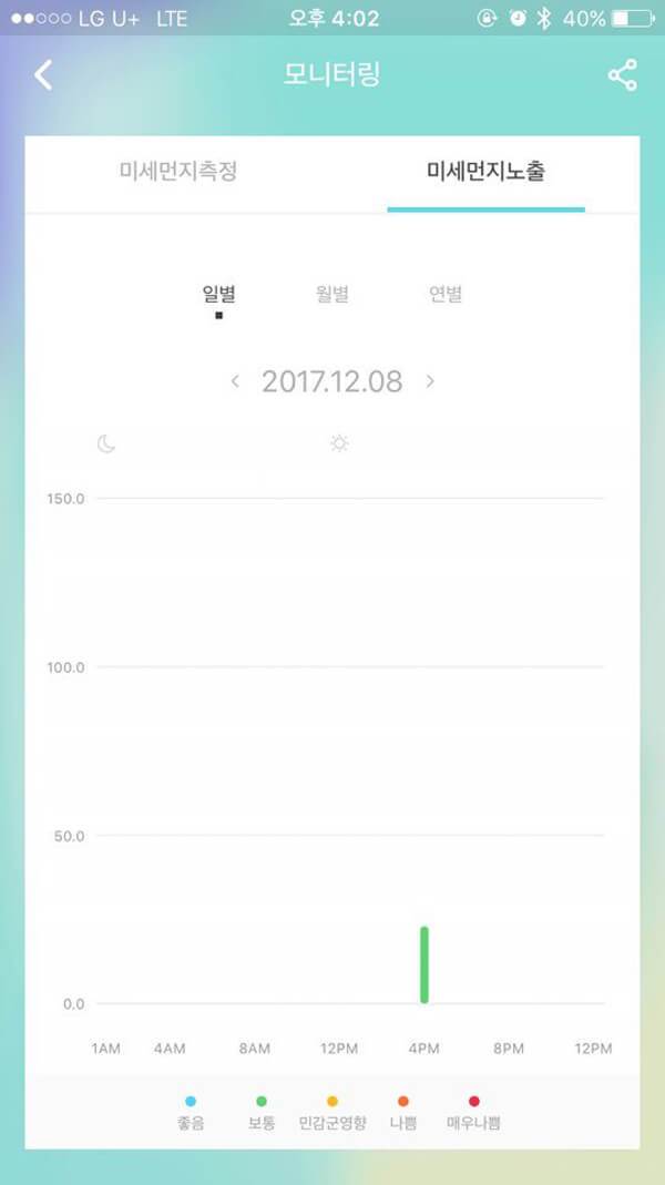또한 모니터링 메뉴를 선택하면, 여러 차례에 걸쳐 측정한 미세먼지 지수와 일/월/연별 미세먼지 노출값을 확인할 수 있다. 그동안 측정했던 미세먼지 지수를 한눈에 확인할 수 있으며, 일/월/연별 미세먼지 지수의 변화를 직관적으로 파악할 수 있다.