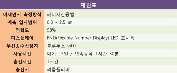 측면에는 공기를 흡입해 미세먼지를 측정할 수 있는 측정홀이 있다. 이 측정홀에 먼지가 끼면 측정이 원활하지 않을 수 있으니 유의해야 한다. 또한 왼편에는 마이크로 5핀 충전기 또는 USB 케이블을 이용해 충전을 할 수 있는 충전 소켓이 있다. 배터리를 완전히 충전하기까지 약 1시간 정도가 소요되며, 한 번 충전으로 최대 15일까지 사용할 수 있다.