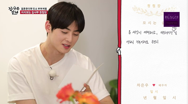 이어 멤버들은 미혼, 기혼 가릴 것없이 자신의 청첩장을 써보는 시간을 가졌다. 결혼에 대해 생각이 많아 보였던 차은우의 청첩장도 공개됐다.