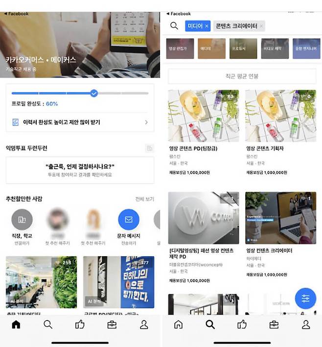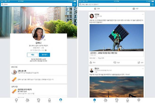 > 프로필 등록, 채용 정보 등이 한데 어우러진 종합 비즈니스 플랫폼다운 메인 화면이다