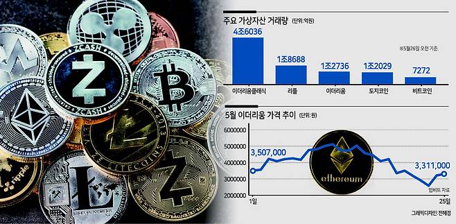 거래량도 이더리움이 비트코인을 압도하고 있다. 이날 오전 업비트 기준 거래량 1위는 이더리움클래식으로 24시간 동안 4조6036억원을 기록했다. 이더리움도 1조2736억원에 달했다. 비트코인 거래량은 7272억원에 불과했다.