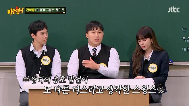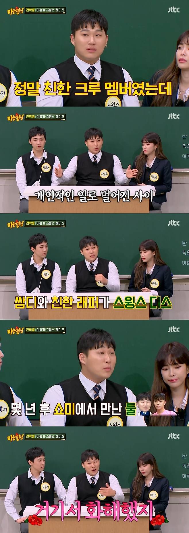 5월 22일 방송된 JTBC '아는 형님'에서 스윙스는 쌈디와의 디스전을 회상했다.