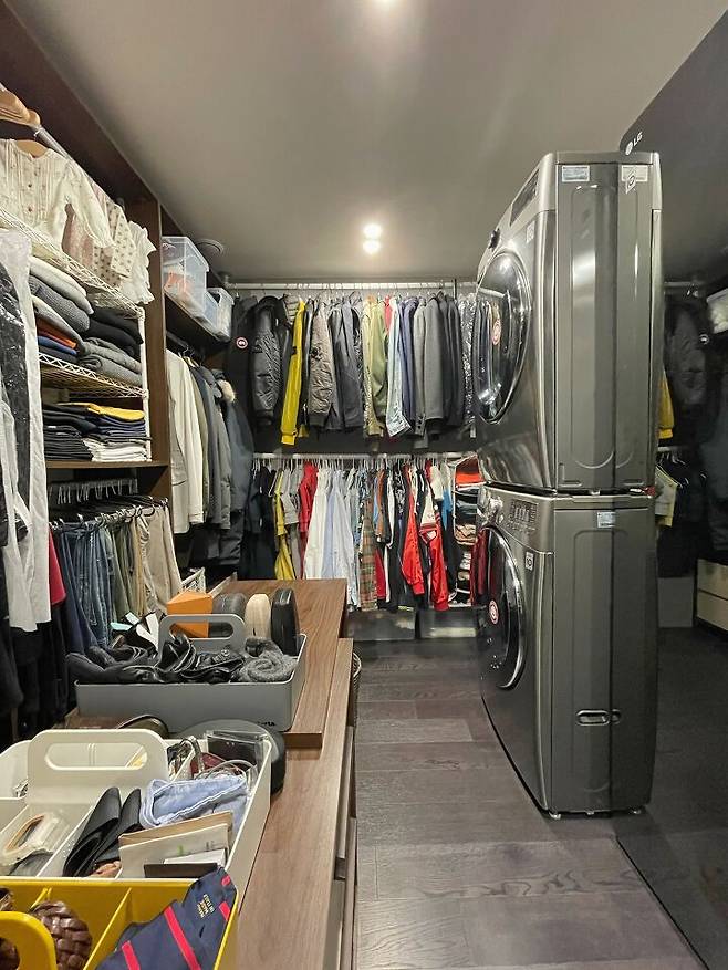 나머지 방으로는 드레스룸을 만들었어요. 이사오기 전부터 사용하던 시스템 옷장을 방 전체를 빙 둘러 설치했구요. 세탁기, 건조기, 스타일러, 청소기와 같은 가전들도 모두 이 방 안으로 들여놨어요. 덕분에 다른 공간을 더 쾌적하고 넓게 사용하고 있습니다.