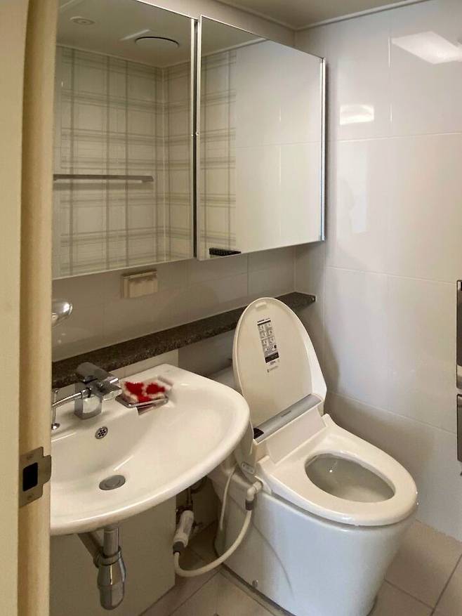 한편 안방 화장실이 있던 공간은 건식으로 리모델링하여, 파우더룸으로 꾸몄어요. 둘이 살면서 화장실 2개가 딱히 필요하지 않다는 걸 깨닫고 리모델링을 결심했습니다. 세면대가 매립된 하부장과 큰 거울로, 남편과 제가 아침에 함께 사용하기에도 부족함이 없는 공간이에요.