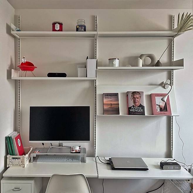 벽선반을 활용해서 서재 공간은 최대한 컴팩트하게 만들었어요. 흰색 철재선반과 깔끔한 디자인의 컴퓨터 주변기기들로 최대한 색감을 통일했구요. 윗선반에는 주로 소품을 진열해주고 있고 아래에는 폭이 넓은 선반을 활용해서 간이책상을 만들었어요.