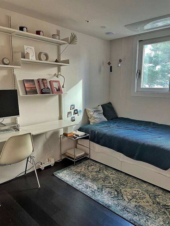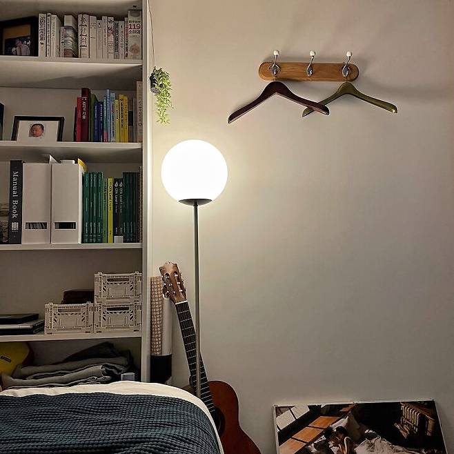 창문가에는 침대를 두었는데요. 평소에는 베드 스프레드로 덮어서 먼지가 쌓이는 걸 막아주고 있어요. 그리고 책장, 서랍, 코트랙과 같은 수납용품을 곳곳에 더해서 이런저런 학용품과 잡동사니를 보관하고 있습니다.