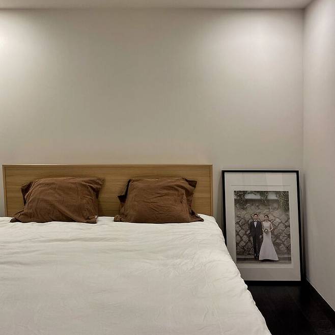자는 방 안에 잡동사니가 많은 걸 좋아하지 않아서, 안방에는 최소한의 것들만 두고 있어요. 나무 무늬의 침대와 TV장, 그리고 결혼식 액자만 있는데요. 이불과 배게커버, 암막커튼도 화이트, 베이지, 브라운으로 매치해서 전체적으로 깨끗한 느낌으로 사용하고 있습니다.