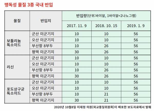 그런데 미군 측의 이 해명 역시 거짓이었다. 지난해 10월 이재정 의원이 국회 외교통상위원회 국정감사에서 밝힌 바에 따르면 2016년 이후 미군은 부산항 8부두로 리신, 포도상구균 톡소이드(병원균의 독성을 제거하고 면역을 발생시키는 능력만 남긴 물질) 등을 반입·실험했다. 더 나아가 2019년과 2020년에는 미군 방위산업체 배틀리 사가 주한미군기지 세균실험실에 근무할 전문 인력을 채용하는 공개 구인광고까지 냈다.