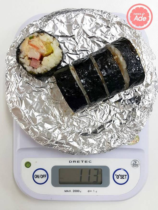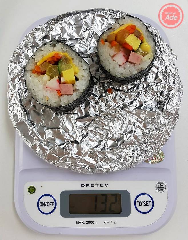 우리 안에 있는 모든 과감한 에너지를 끌어모을 순간이다. 0.68g을 포기한다. 그렇게 산출된 134g이다. 김밥을 얹어보자. 일단 3개, 2개, 1개.