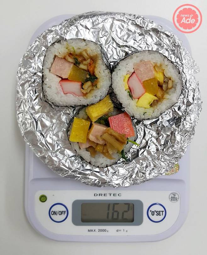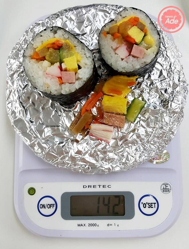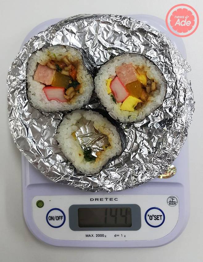 예상은 했지만 쉽지 않다. 김밥 5개를 먼저 올린 후 패닉에 빠졌다. 133g과 153g 사이에서 갈 길을 잃어가던 김밥들, 결국 분해하기로 결정했다.(김, 밥, 햄, 단무지, 달걀, 맛살 등등의 각 칼로리가 다른 것은 알지만 우리는 g에만 집중할 것입니다.)