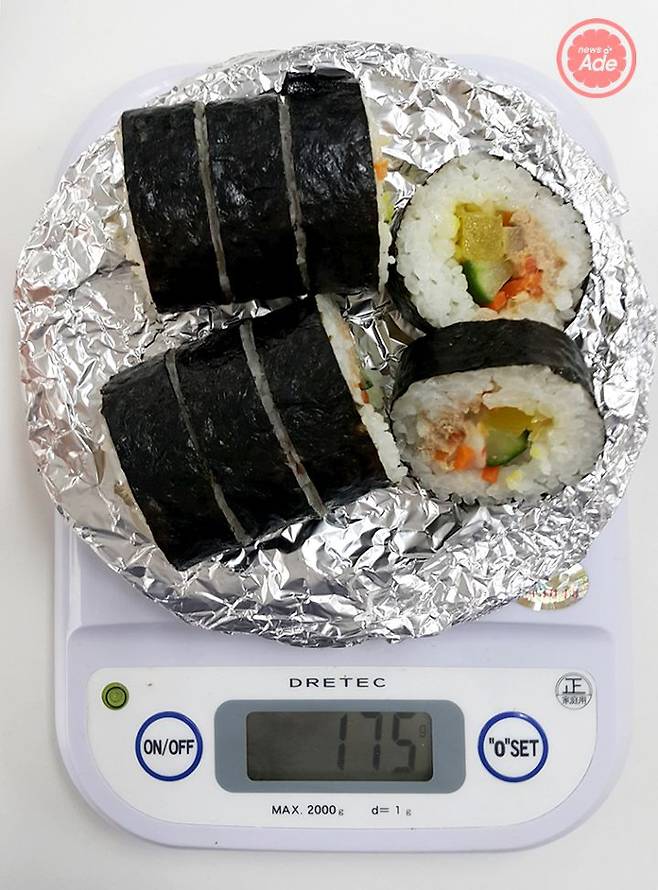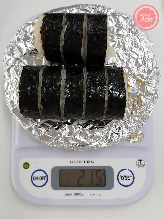 김밥 8조각을 올렸을 때 아름다운 217g이라는 숫자가 나타났다.