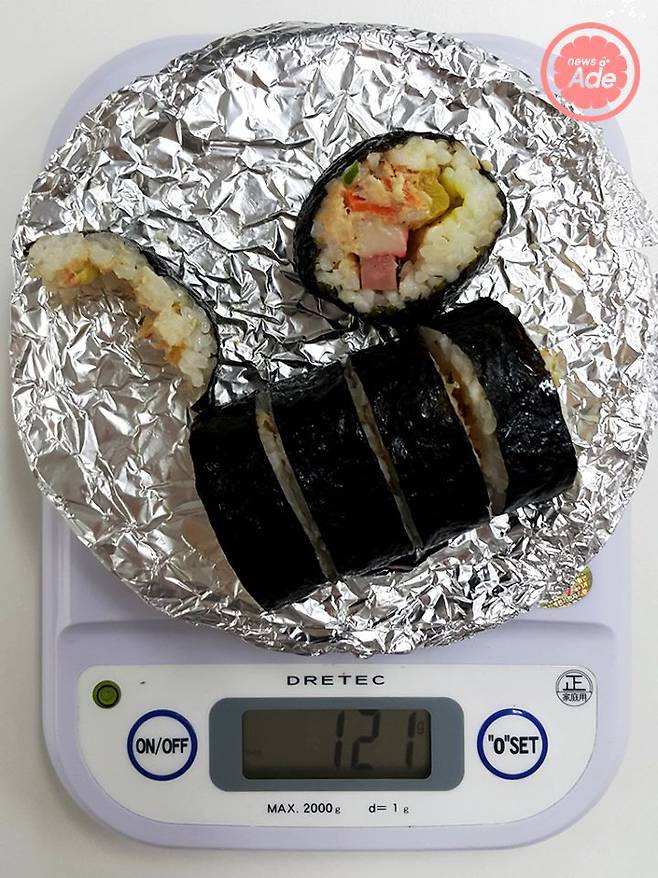 김밥 4개, 끝부분 1개, 그리고..한 입 베어문 것 같은 1조각을 조심스럽게 더하니 121g이 만들어졌다. 저 한 입은 속재료를 모두 빼낸 후 약 1/3 조각을 내면 된다.