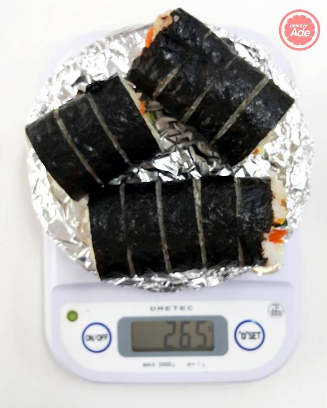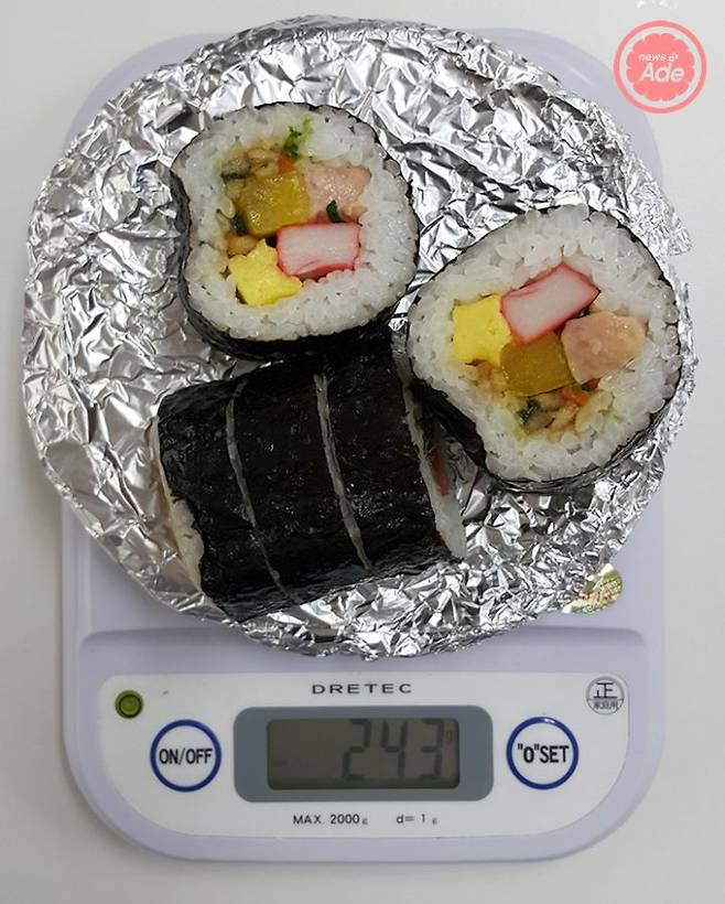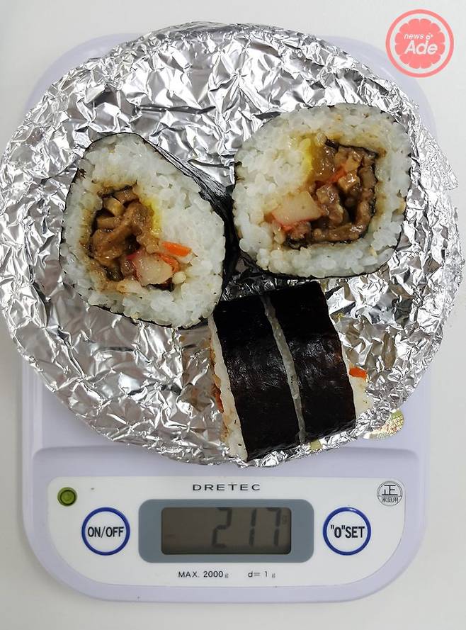 김밥 8조각을 올렸을 때 아름다운 217g이라는 숫자가 나타났다.