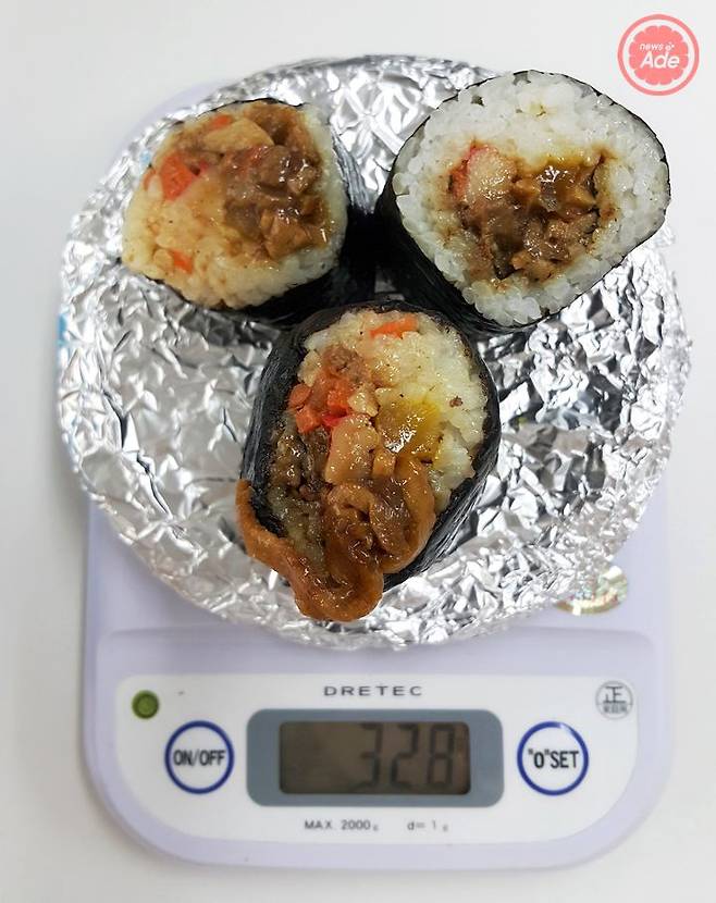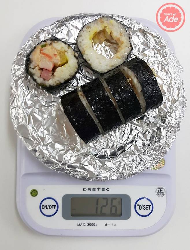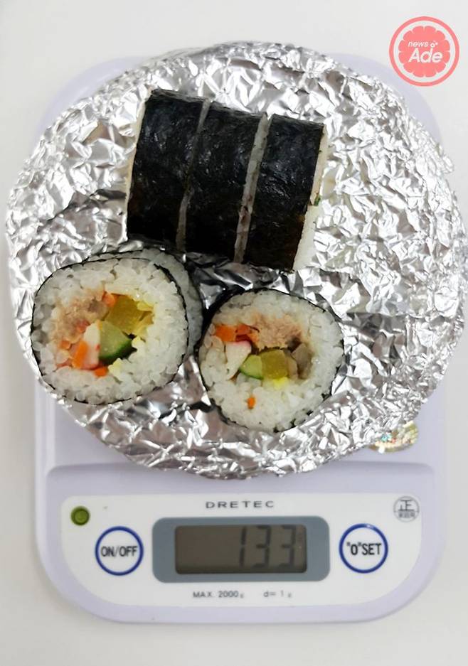 우리 안에 있는 모든 과감한 에너지를 끌어모을 순간이다. 0.68g을 포기한다. 그렇게 산출된 134g이다. 김밥을 얹어보자. 일단 3개, 2개, 1개.