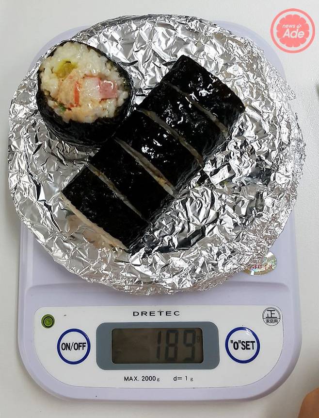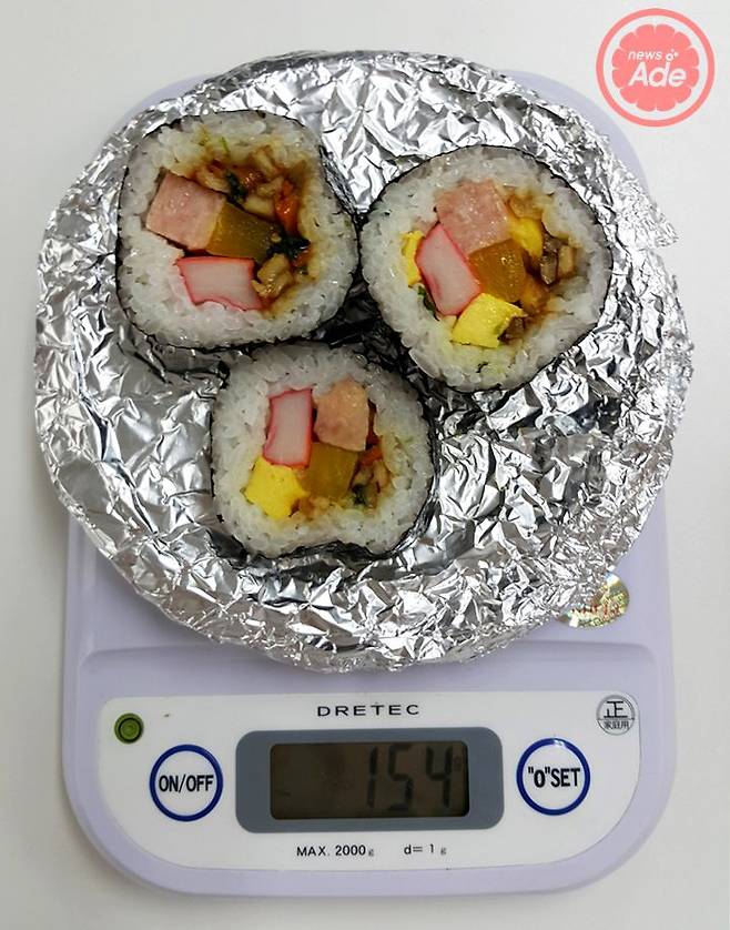 예상은 했지만 쉽지 않다. 김밥 5개를 먼저 올린 후 패닉에 빠졌다. 133g과 153g 사이에서 갈 길을 잃어가던 김밥들, 결국 분해하기로 결정했다.(김, 밥, 햄, 단무지, 달걀, 맛살 등등의 각 칼로리가 다른 것은 알지만 우리는 g에만 집중할 것입니다.)