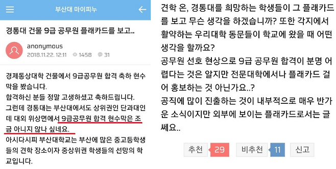 2018년 11월 부산대학교 사내 온라인 커뮤니티에는 ‘경통대 건물 9급 공무원 플래카드를 보고’라는 게시물이 올라왔다. 앞서 부산대엔 9급 공무원 시험에 합격한 부산대 학생을 축하하는 내용의 플랜카드가 경제통상대학 건물에 걸려있었다. 게시물 작성자는 먼저 “합격한 분들 고생했고 축하드립니다”라고 했다. 그러면서 “경통대는 부산대에서도 상위권인 단과대인데 대외 위상면에서 9급공무원 합격 현수막은 조금 아니지 않나 싶다”고 문제를 제기했다.