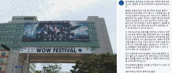 재학생 커뮤니티에는 학생 동의 없이 상업적인 광고를 붙여도 되는지 논란이 벌어졌다. 총학생회 측은 "대동제를 여는 과정에서 예산이 부족했다. 무대를 멋지게 꾸미려다 보니 생긴 불찰"이라고 해명했다. 부족한 예산을 메우기 위해 외부 기업의 홍보금을 지원받아 축제를 하려 했다는 말이었다. "학우들이 느꼈을 분노와 실망, 허탈함을 조금이라도 풀어내고자 현수막을 걷으려 하고 있으나 계약서상의 위약금 문제로 문제 해결을 쉽게 하지 못하고 있다"고 했다.