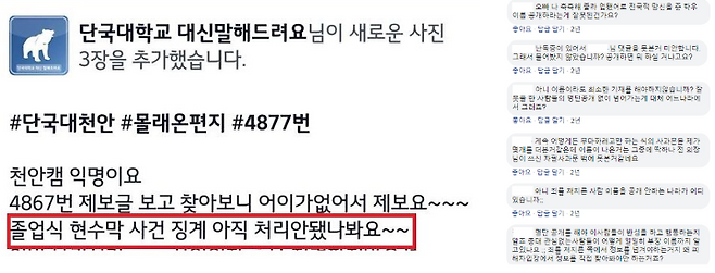 단국대 천안캠퍼스에서도 비슷한 내용의 현수막을 졸업식 때 내걸어 논란이 일었다. 2017년 2월 단국대 천안캠퍼스 학위수여식이 열리던 때였다. 단국대 제32대 백의총대의원회 명의로 학생극장 외벽에는 ‘오빠 나 축*해 졸라 업됐어’ 라는 문구의 현수막이 걸렸다. 빨간 글씨만 읽으면 ‘오빠 축 졸업’이었다. 그러나 상대적으로 작은 검은색 글씨와 함께 읽으면 외설적인 문구였다.