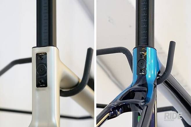 반면, 둥그스름한 튜빙 형태의 디아만테는 스템과 포크 헤드셋을 통합한 ‘모노리씩(Monolithic)’ 디자인으로 더욱 공격적이고 에어로 다이나믹한 포지션을 효과를 높였다. 프로레이서들을 위해 창안된 이 디자인은 편안한 포지션으로 변경이 가능하도록 헤드셋 부분에 원뿔형 공간을 만든 것이 특징이다.