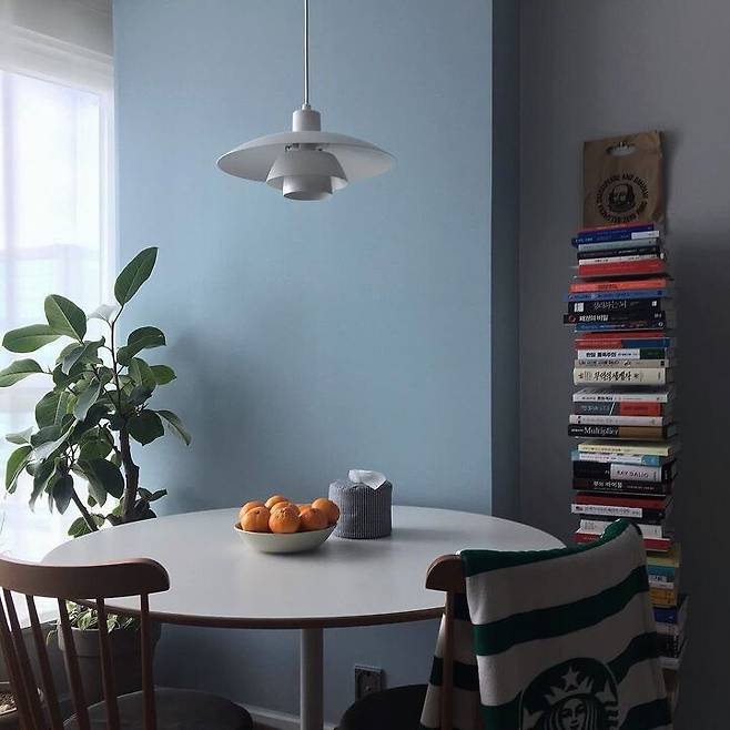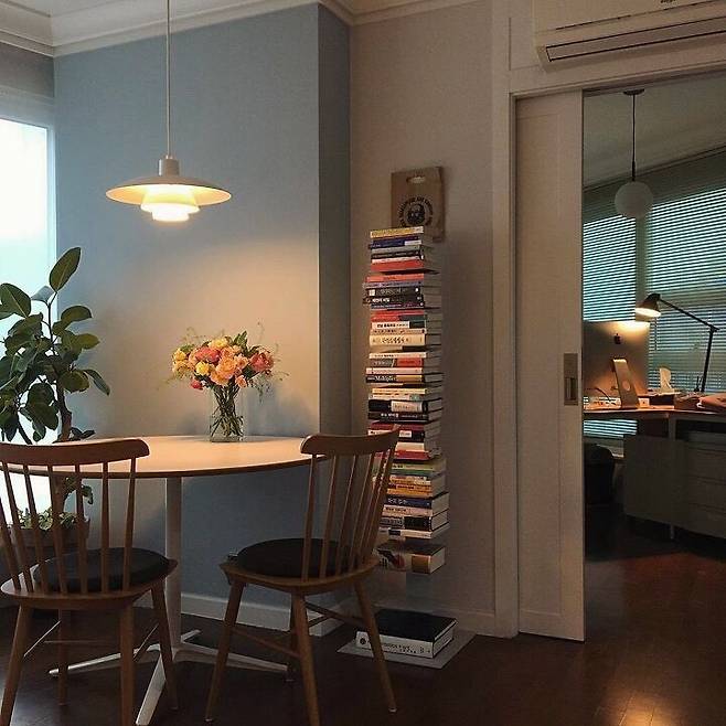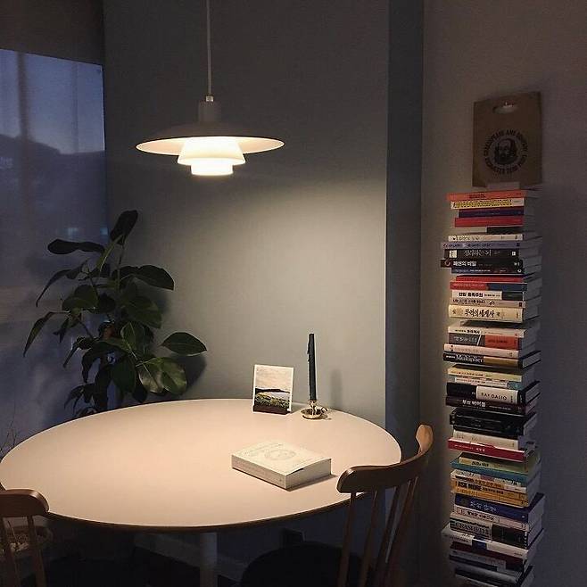 의자 : TON chair IRONICA / 펜던트등 : Louis Poulsen PH ¾ / 책꽂이 : 두닷 NEW 밀라노 1500 북선반 / 테이블 : 플랜제이 609X TABLE WHITE