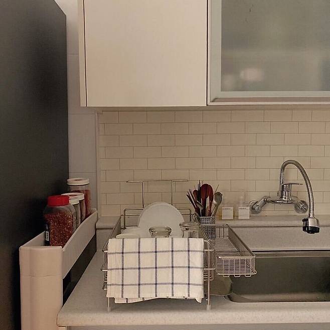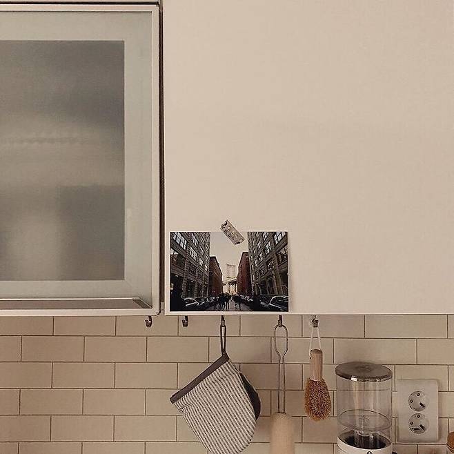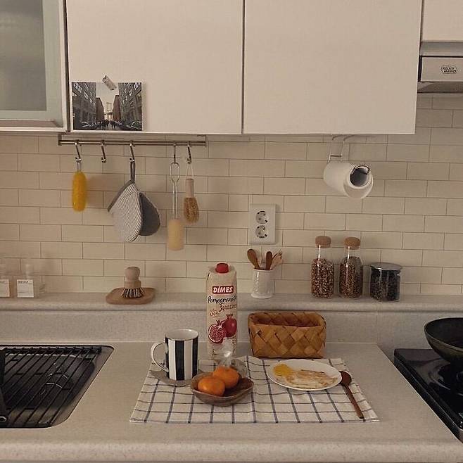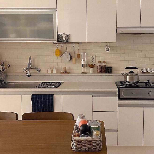최근에 주방 벽면에 시트지를 붙였는데 분위기 전환도 되고 너무 좋아요! 그리고 레인지대에는 패브릭을 덮고 그 위에 커피용품을 놓으니 홈카페 분위기가 나서 마음에 들어요.
