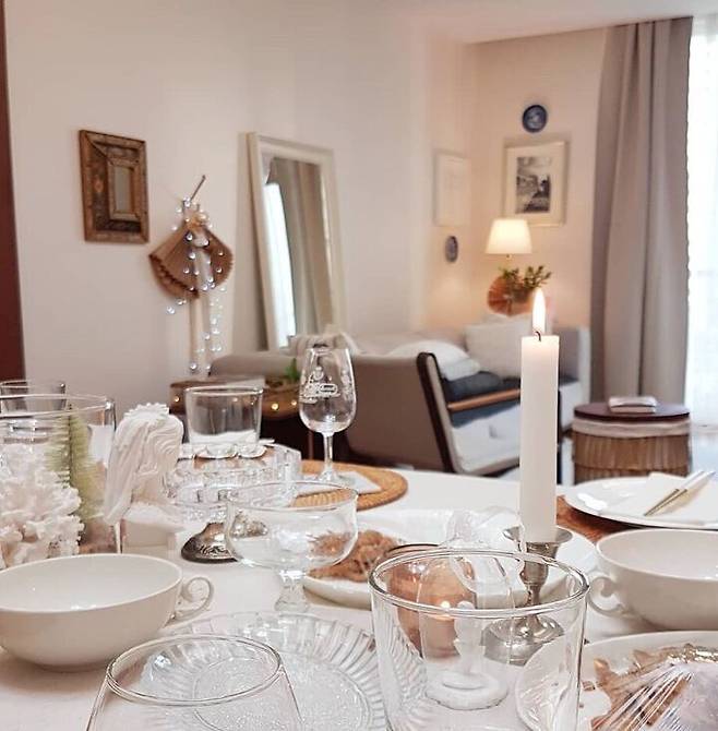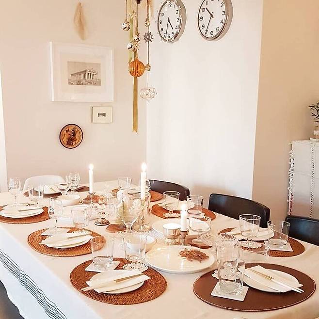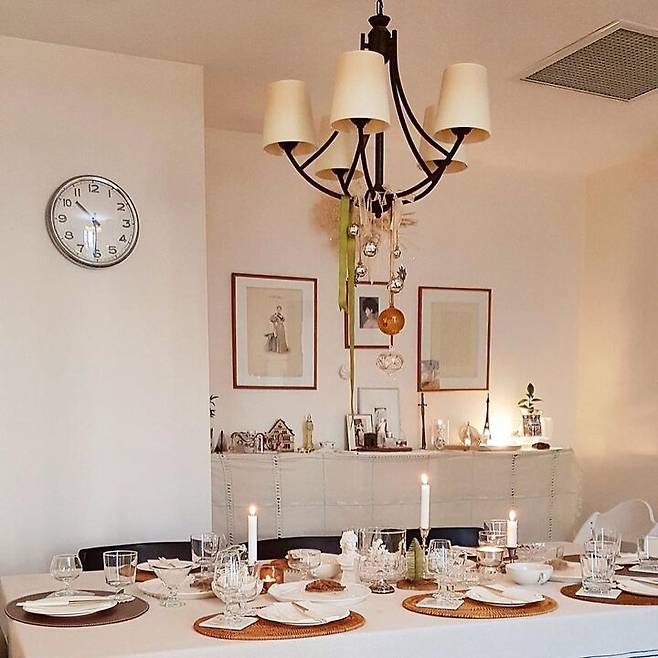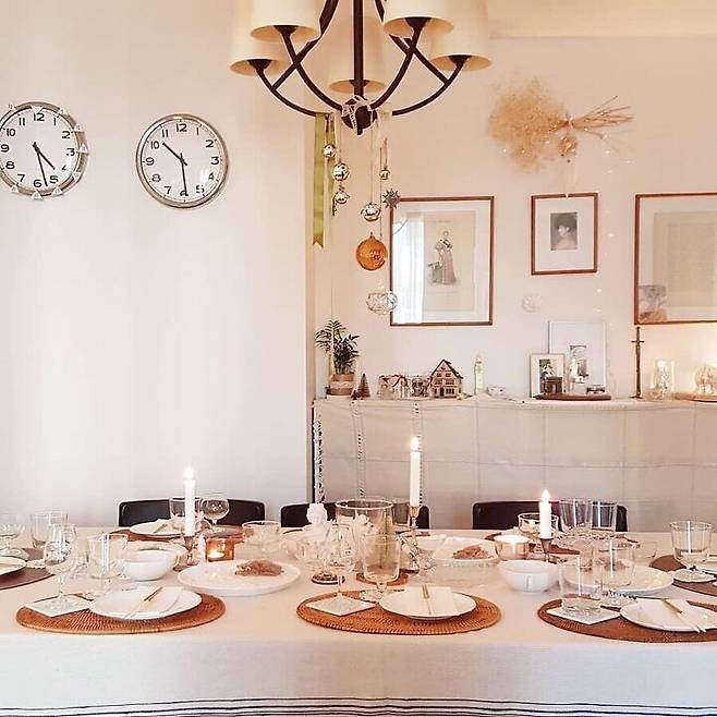의자 : 이케아 IDOLF 이돌프 의자 / 벽시계 : 이케아 PUGG 푸그 벽시계 / 유리컵 : 이케아 IKEA 365+ 고블렛 / 식탁보 : Yargici Home (터키 브랜드) / 펜던트등, 사이드테이블 : 터키 로컬브랜드 / 소파 : 체리쉬 라포레 4인 소파 패브릭 아이보리 / 크리스마스트리 : 이케아 FEJKA 페이카 크리스마스 트리 / 탁상스탠드 : 이케아 ÅRSTID 오르스티드 탁상스탠드, 까사미아 (단종) / 테이블매트 : 무인양품 케탁 런천 매트 타원형 (라탄), H&M home 이미테이션 레더 테이블 매트 (가죽) / 그 외 테이블 데코 소품 : 해외 빈티지샵