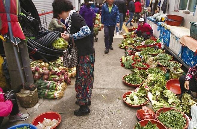 고무 대야에서 퍼덕이는 생선을 들어 올린 할머니의 입에서 구수한 사투리가 줄줄 쏟아져요. 활어시장 옆 골목에는 섬에서 나온 각종 나물과 채소를 파는 노점상들이 자리를 차지해요. 방풍나물과 고사리, 톳 등 각종 채소가 조그만 그릇에 담겨 손님을 기다려요. 아침 7시가 되자 시장 거리에 사람들이 북적여요. 코로나19로 위축되긴 했지만 조금씩 분위기가 살아나요.