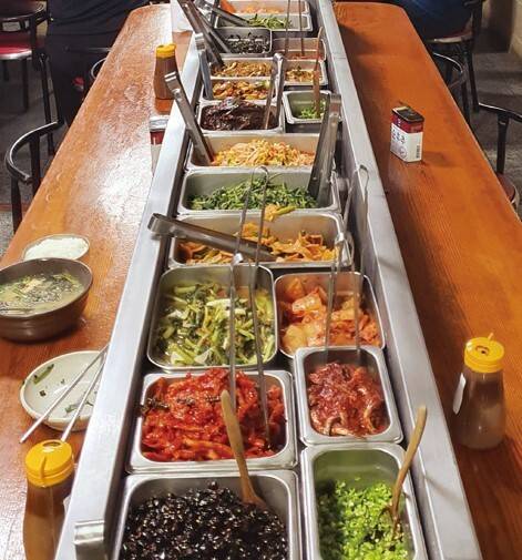 테이블 중앙에는 김치, 멸치볶음, 콩자반, 젓갈 등 10여 가지 반찬을 뷔페식으로 진열했어요. 손님들은 자신이 원하는 반찬을 먹을 만큼 접시에 담아요. 한 그릇에 6000원. 통영에서 시락국을 먹는 법이 따로 있어요. 제피 가루와 김 가루, 부추무침을 넣어 먹어요. 시락국과 어깨를 겨누는 서호시장 먹거리는 졸복국이에요.