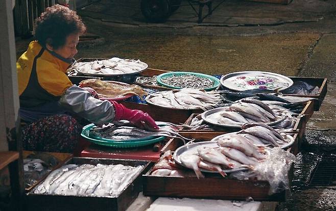 생선을 파는 이들은 대부분 할머니예요. 40~50년을 이곳에서 생선 팔아 자식들을 가르쳤고 손주 용돈을 줘요. 대야가 바닥에 있으니 허리를 펼 틈이 없어요. 흥정할 때도 손님 얼굴을 보지 않아요. 아니, 볼 틈이 없어요. 허리를 굽힌 채 주문을 받고, 허리를 굽힌 채 생선을 손질하고, 허리를 굽힌 채 비닐봉지에 담아 손님에게 줘요. 시간이 남으면 스티로폼을 깔고 구부리고 앉아 멍게를 따고, 굴을 까고, 새우 껍데기를 벗겨 팔았어요. 그래서 할머니들의 허리는 굽었어요. 굽은 허리는 그녀들의 강인한 삶의 역사이고 흔적이에요. 애잔해요.
