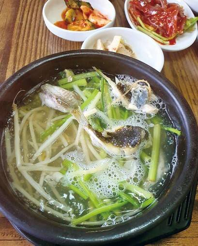 졸복은 10㎝ 안팎의 작은 복어로 작고 볼품없어 30년 전만 해도 먹지 않고 버릴 정도였어요. 졸복은 다른 복 종류보다 강한 독을 품고 있어 조금만 잘못 먹어도 입술과 혀가 바로 마비되요. 졸복 내장을 깨끗이 손질해 미나리, 콩나물, 무를 넣어 맑게 끓여내면 숙취 해소에 그만이에요. 졸복국을 먹을 때 식초 한 방울 더하면 복어의 독성을 눌러준다고 해요. 서호시장의 복 전문집은 여러 집. 송이식당 주인은 시아버지가 하던 복집을 물려받아 언니와 함께 운영해요. 졸복 맑은탕과 함께 내놓은 멸치회가 입맛을 돋워요.