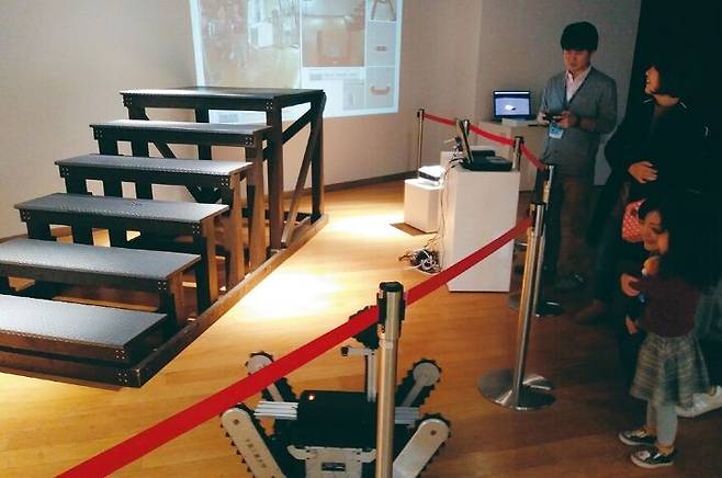 로봇의 눈을 뒤로하고 건물 안으로 들어서니 이번엔 2011년 3월 동일본대지진 당시 후쿠시마 원자력발전소에 투입된 구조로봇이 눈길을 잡아끌었어요. 이 로봇은 사람이 접근할 수 없는 원자로 건물에서 데이터를 얻어내 피해를 최소화하는 데 큰 도움을 줬어요. 특히 다른 로봇보다 월등히 빠른 30㎝/s 이상의 속도로 자율주행이 가능해요. 또한 탑재한 검사 장비를 이용해 사용후핵연료를 자동으로 인식·검사할 수 있어 사람의 방사선 피폭 우려도 덜어줘요.