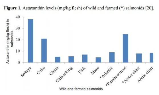 야생 연어와 양식 연어(*표)의 아스타잔틴 함량 (Mar. Drugs 2014, 12, 128-152)